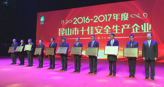 其中,華辰裝備獲頒2016~2017年度昆山市“十佳安全生產(chǎn)企業(yè)”殊榮,華辰裝備董事長曹宇中先生登臺(tái)接受昆山市副市長宋德強(qiáng)頒獎(jiǎng)。